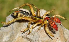 A cópula é rápida e violenta. O macho imobiliza a fêmea que fica letárgica, massageia seu opistossoma e abre seu orifício genital com as quelíceras. A seguir ele emite uma massa espermática sobre a terra, pega-a com as quelíceras e a introduz no orifício genital feminino. Em seguida, o macho foge, geralmente perseguido pela fêmea.
